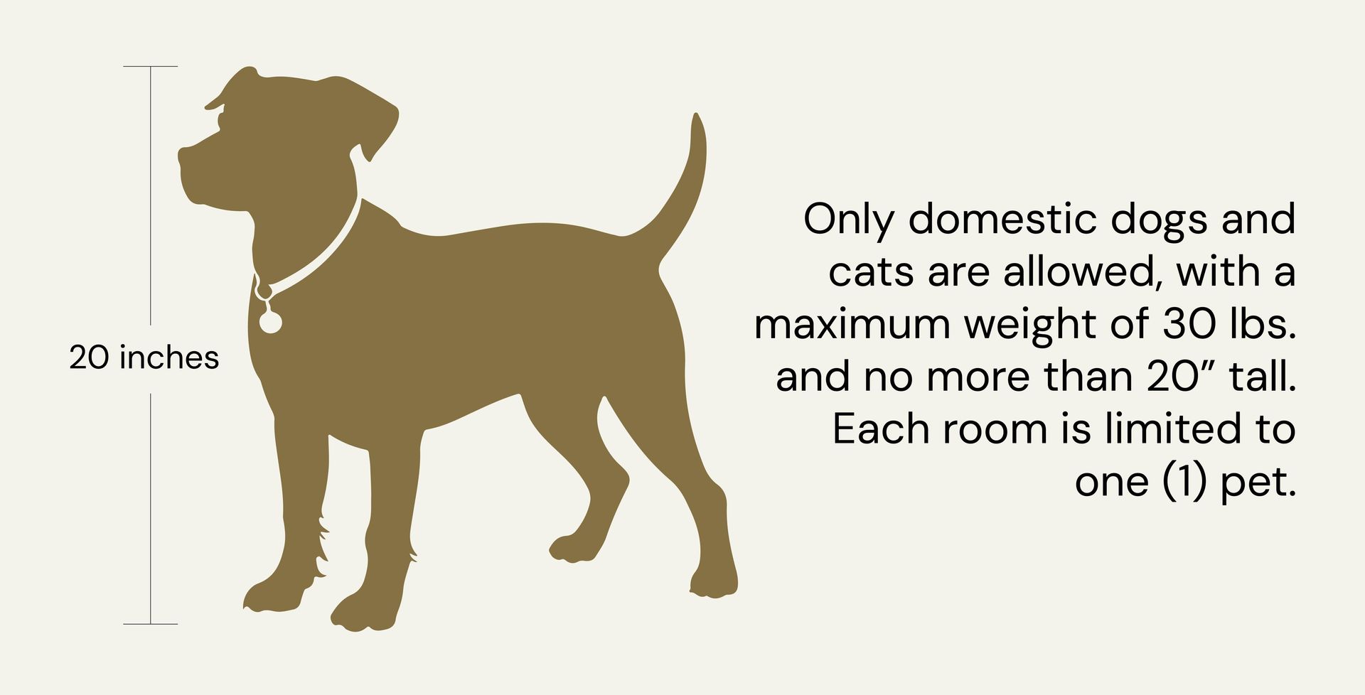 - Only domestic dogs and cats are allowed, with a maximum weight of 30 lbs and a maximum height of 20". Exotic/wild animals, birds, rodents, insects, reptiles, and any other animals not specified above are strictly prohibited.